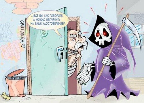 Звонок в дверь. Хозяин открывает дверь, а на пороге смерть стоит. Только не в черном балахоне, а вся в ленточках, бантиках, с шариками надувными и тазиком на голове вместо капюшона.